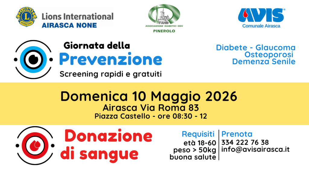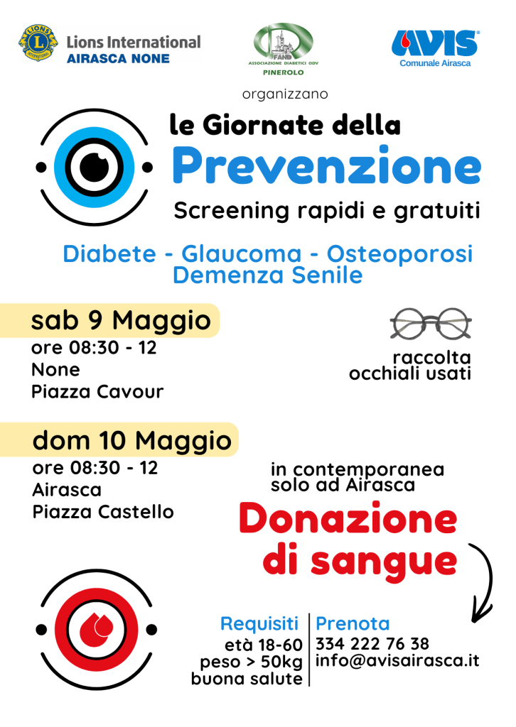 Sempre domenica 10 maggio, nella stessa piazza saranno presenti le l’associazione Lions Airasca None insieme all’Associazione Diabetici Odv di Pinerolo grazie alle quali sarà possibile sottoporsi senza prenotazione a diversi test di screening gratuiti: diabete, glaucoma, osteoporosi e demenza senile.